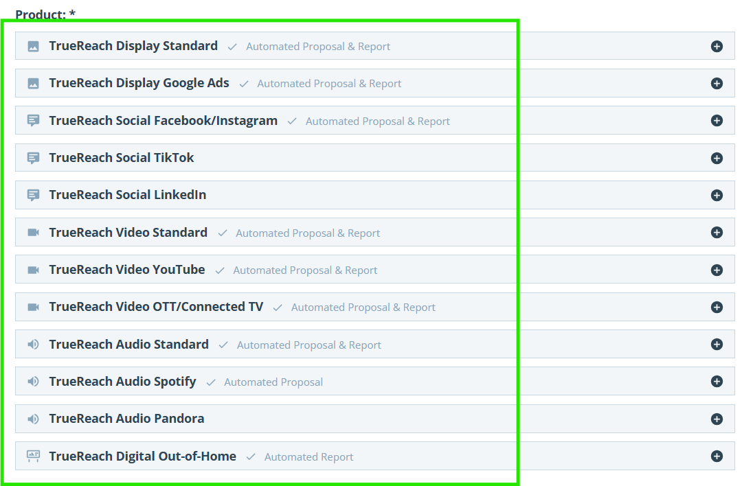 For example, radio is often used as a brand awareness marketing strategy. The goal is to give listeners a new piece of information (in this case, your advertiser's radio commercial!) In parallel, the advertiser can also reach an online audience as a brand awareness marketing strategy with a variety of digital products (TrueReach Display Standard, TrueReach Display Google Ads, TrueReach Social Facebook/Instagram, TrueReach Social TikTok, TrueReach Social LinkedIn, TrueReach Video Standard, TrueReach Video YouTube, TrueReach Video Ott/CTV, TrueReach Audio Standard, TrueReach Audio Spotify, TrueReach Audio Pandora, TrueReach DOOH) as per the extensive list below from the SoCast Reach proposal builder:
