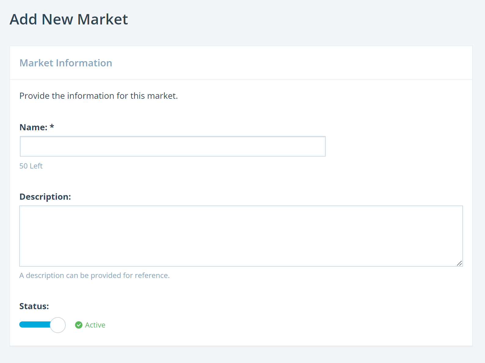 - Status: Select Enabled to make the market active and available for campaigns. Select Inactive if you do not want the market to be assigned to campaigns.